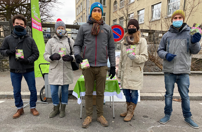 So auch die Grünen und Jungen Grünen der Region Olten, die an diesem frostigen Morgen Tütchen mit Pflücksalatsamen an die Passantinnen und Passanten verteilten. Die beiden Kantonsrätinnen Anna Engeler und Myriam Frey Schär, der Stadtratskandidat und frischgebackene Vater Raphael Schär-Sommer sowie, als Vertreter der Jungen Grünen, Lukas Lütolf und Jonas Ammann rührten gemeinsam die Werbetrommel für die Kantons- und Stadtratswahlen am 7. März. Als erfahrener Kommunalpolitiker, der ausserdem auf ein langjähriges Engagement in verschiedenen gemeinnützigen Projekten zurückblicken kann, bringt Raphael Schär-Sommer allerbeste Voraussetzungen für ein städtisches Exekutivamt mit. Seine Kernthemen für die Entwicklung der Stadt Olten sind mehr Klimaschutz, mehr Naherholung und Lebensqualität, mehr Platz für Velofahrerinnen und Fussgänger, mehr Betreuungsangebote für Kinder, mehr Mitwirkung bei der Stadtentwicklung und mehr Effizienz. Die beiden Kantonsrätinnen wiederum machen sich weiterhin stark für eine nachhaltige Politik auf Kantonsebene, welche mit zukunftsweisenden Lösungen auf die Anliegen der Einwohnerinnen und Einwohner und des ansässigen Gewerbes eingeht und die zum Erhalt unserer Natur und Landschaft beiträgt. Die beiden Jungen Grünen ihrerseits bringen die Perspektive einer neuen politischen Generation ins Spiel. Politisch bereits ausgesprochen versiert, haben sie die entscheidenden Themen dieser Zeit fest im Blick und liefern wichtige Impulse, etwa zur Bewältigung der Klimakrise.