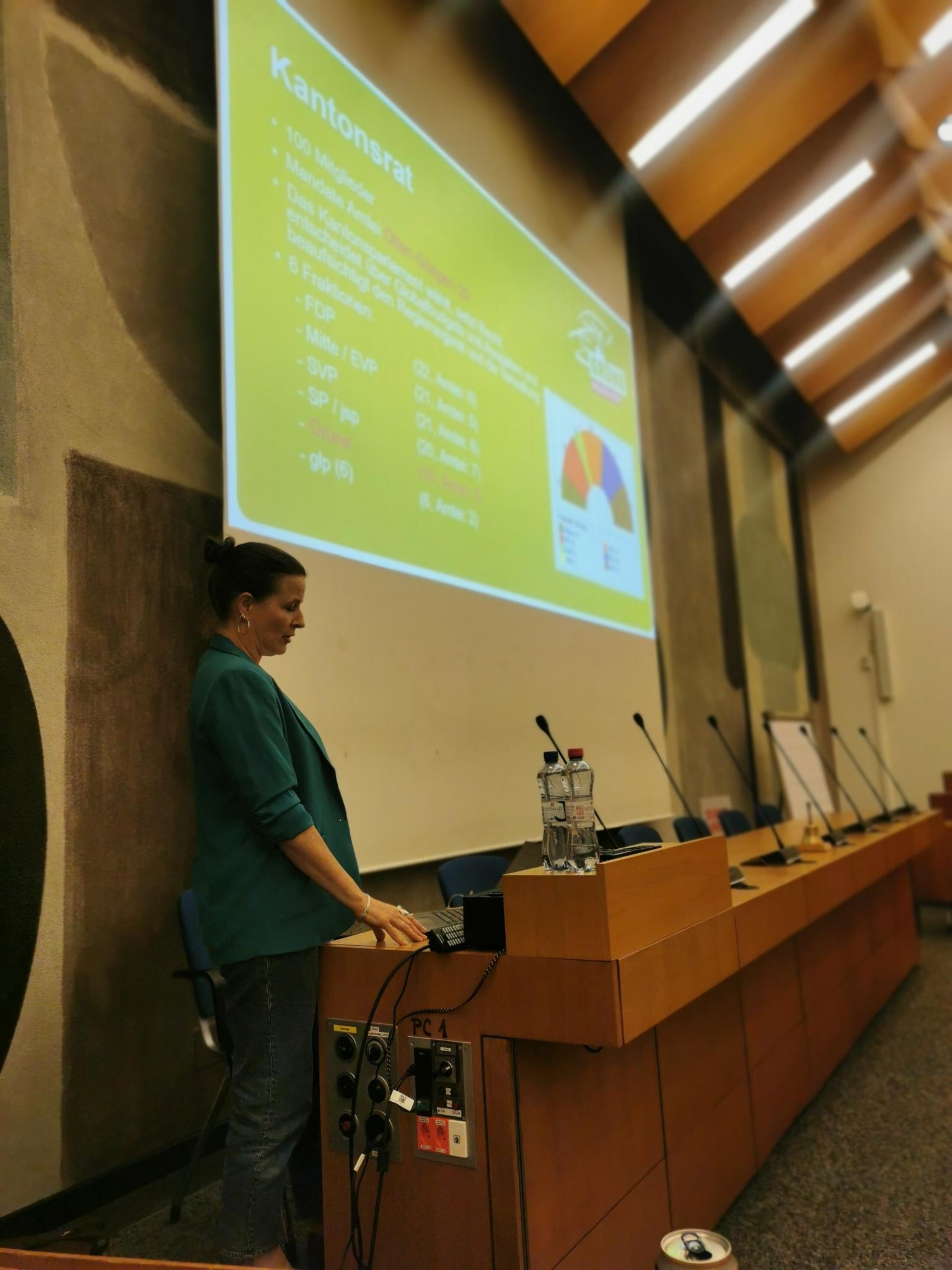 Im Anschluss trat Laura Gantenbein als Präsidentin der kantonalen GRÜNEN aufs Podium und zeigte sich hocherfreut, den Reigen der Nominationen in den verschiedenen Amteien mit einem derart erfolgreichen Anlass eröffnen zu dürfen. Sie schwor die Anwesenden ein auf einen erfolgreichen und konstruktiven Wahlkampf und überbrachte dem Sektionspräsidium ein kleines Gastgeschenk.