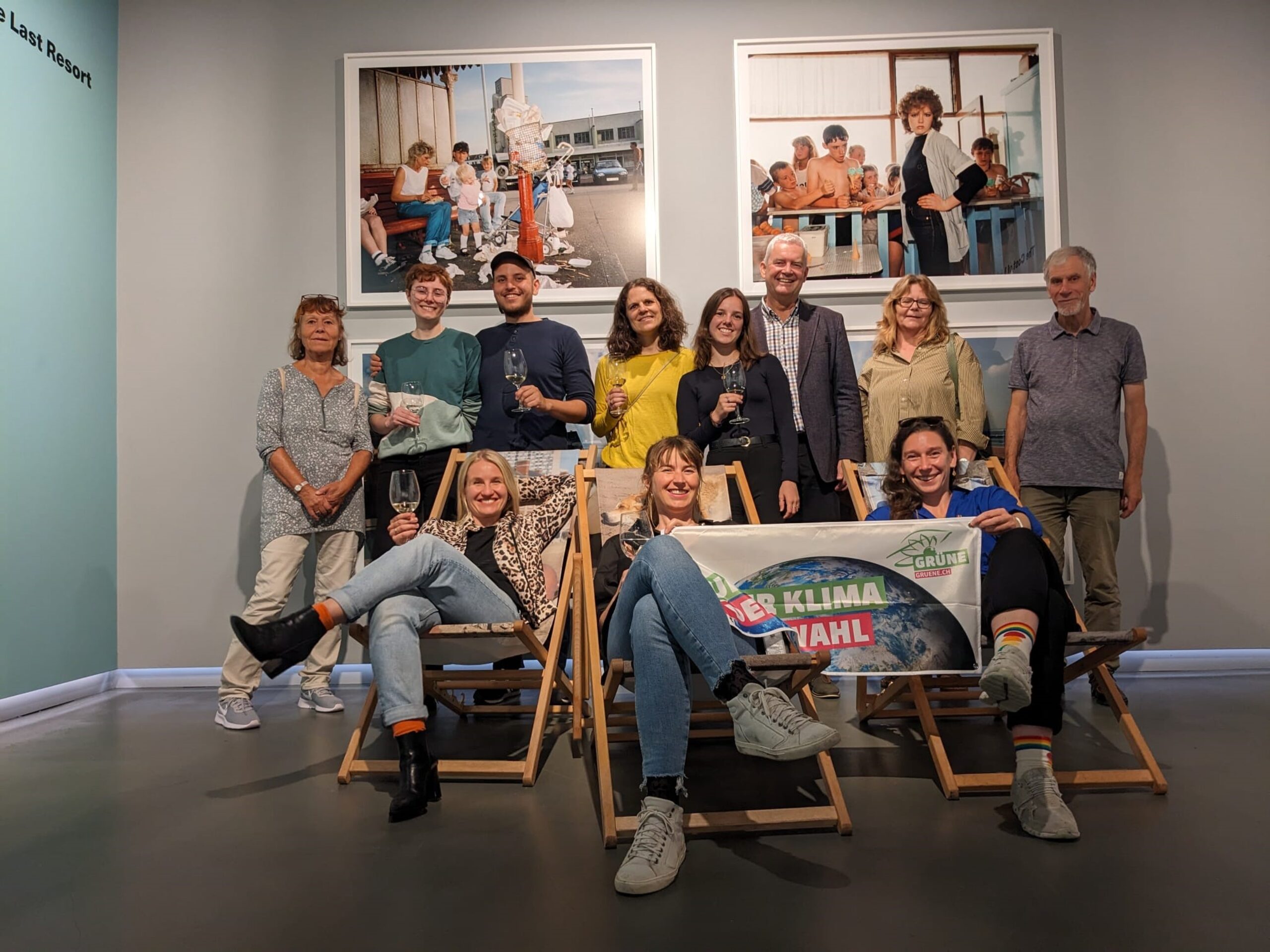 Vor den Bildern aus der Serie «The Last Resort» posieren die GRÜNEN: In den Liegestühlen, die Teil der Ausstellung sind, die Nationalratskandidatinnen Marlene Fischer, Anna Engeler und Laura Gantenbein (v.l.), in der hintere Reihe Nationalratskandidatin Yael Schindler Wildhaber (4.v.l.) sowie Nationalrat und Ständeratskandidat Felix Wettstein (6.v.l.).
