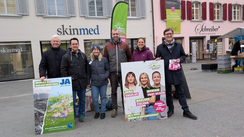 Am letzten Donnerstagsmarkt warben die Grünen Kantonsratskandidierenden Yael Schindler, Simon Nussbaumer und Marlene Fischer für die Anliegen der eidgenössischen Umweltverantwortungsinitiative. Diese fordert, dass wir als Gesellschaft nur so viele Ressourcen nutzen, wie sich regenerieren lassen. Unterstützung erhielten sie von Stadtrat Raphael Schär-Sommer und Nationalrat Felix Wettstein. Für sie ist es wichtig, die natürlichen Lebensgrundlagen zu erhalten und die Initiative sozial gerecht umzusetzen.